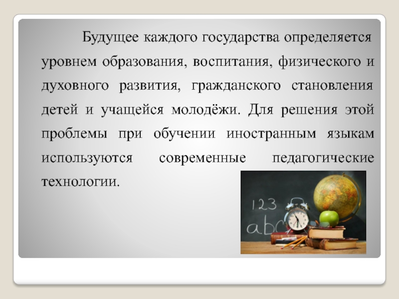 воспитания, физического и духовного развития, гражданского становления детей и учащейся молодёжи. Для решения этой проблемы при обучении иностранным языкам используются современные педагогические технологии.