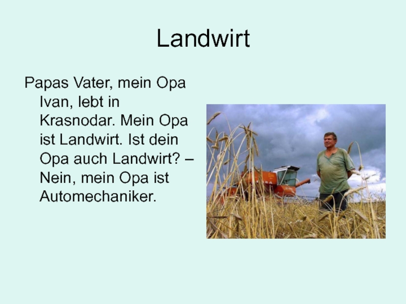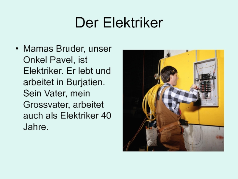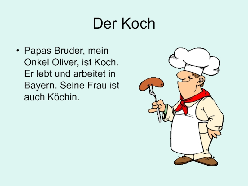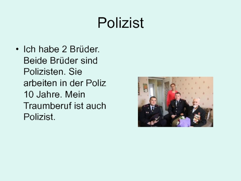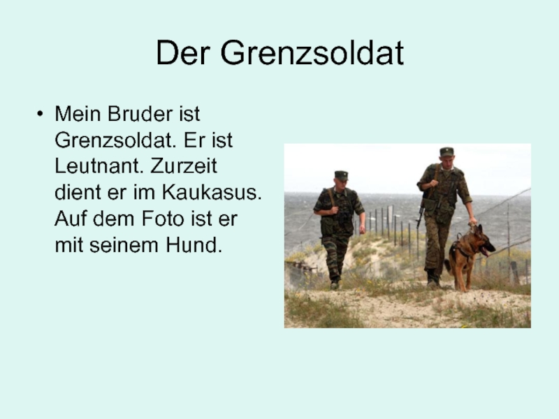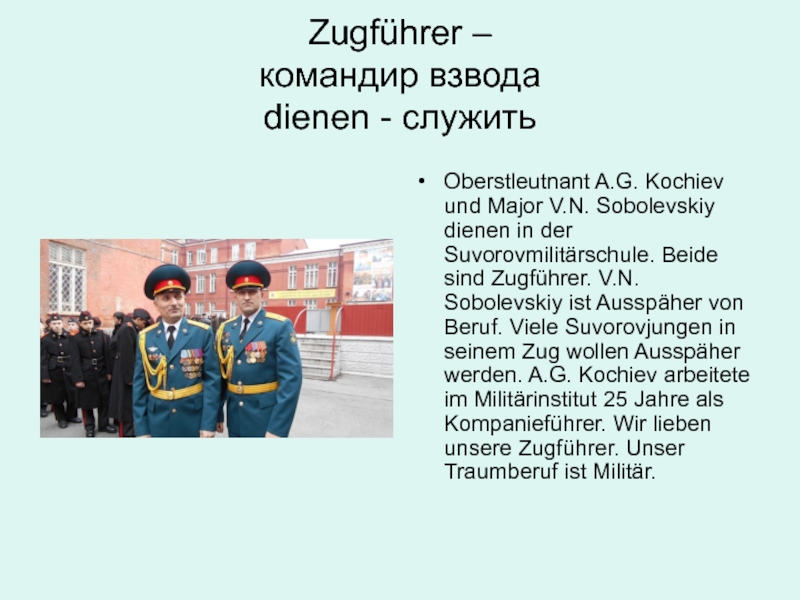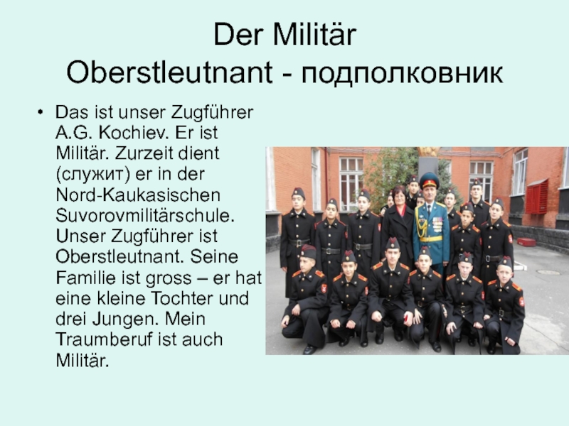 Militär. Zurzeit dient (служит) er in der Nord-Kaukasischen Suvorovmilitärschule. Unser Zugführer ist Oberstleutnant. Seine Familie ist gross – er hat eine kleine Tochter und drei Jungen. Mein Traumberuf ist auch Militär.