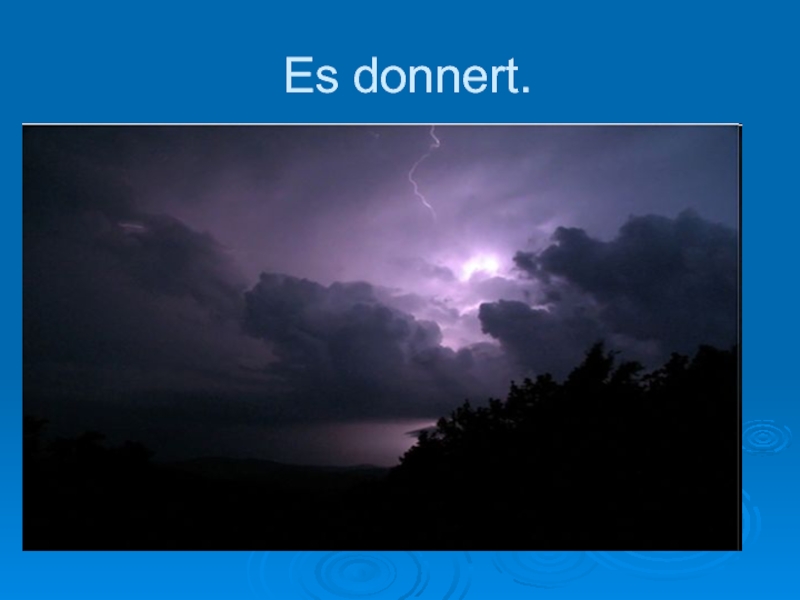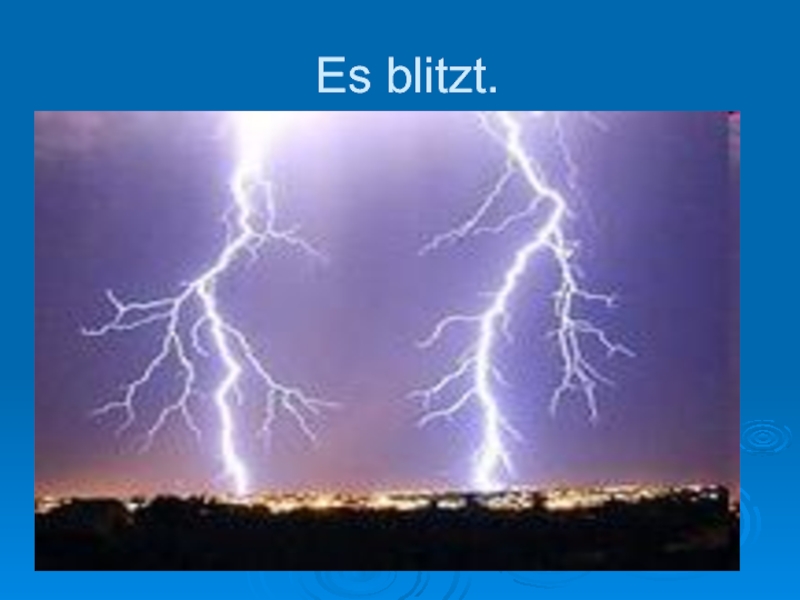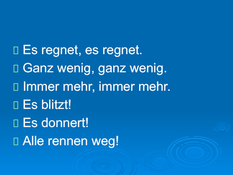 Es regnet, es regnet.Ganz wenig, ganz wenig.Immer mehr, immer mehr.Es blitzt!Es donnert!Alle rennen weg!