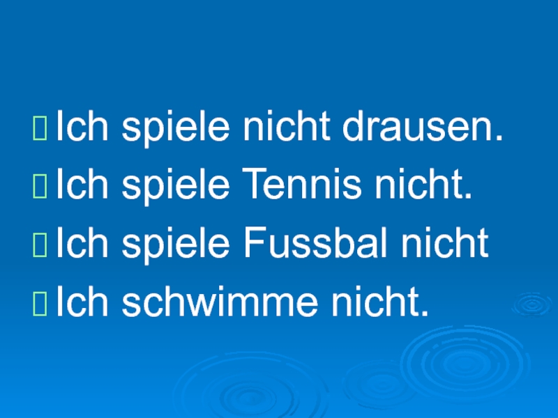 Ich spiele nicht drausen.Ich spiele Tennis nicht.Ich spiele Fussbal nichtIch schwimme nicht.