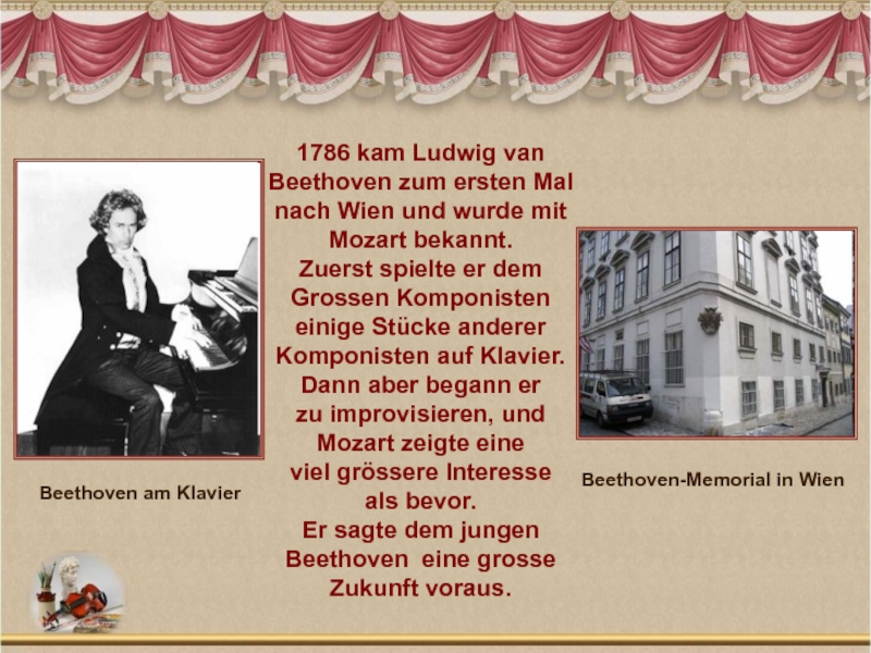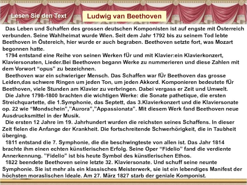 engste mit Österreich verbunden. Seine Wahlheimat wurde Wien. Seit dem Jahr 1792 bis zu seinem Tod lebte Beethoven in Östereich, hier wurde er auch begraben. Beethoven setzte fort, was Mozart begonnen hatte.
