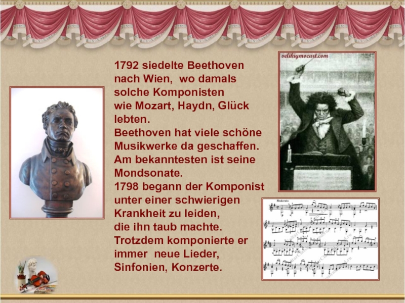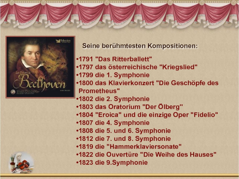 1794 entstand eine Reihe von seinen Werken fÜr und mit Klavier:ein Klavierkonzert, Klaviersonaten, Lieder.Bei Beethoven begann Werke zu nummerieren und diese Zahlen mit dem Vorwort “opus” zu bezeichnen.