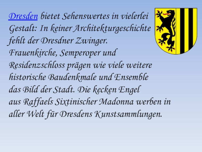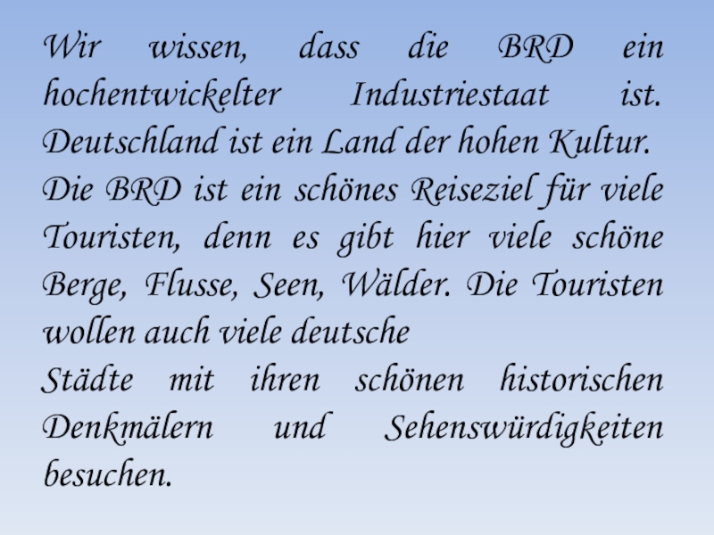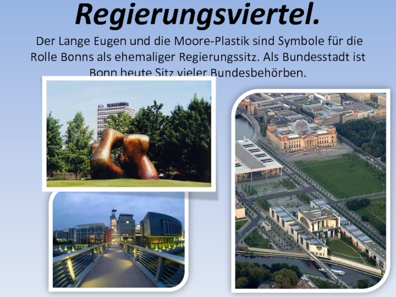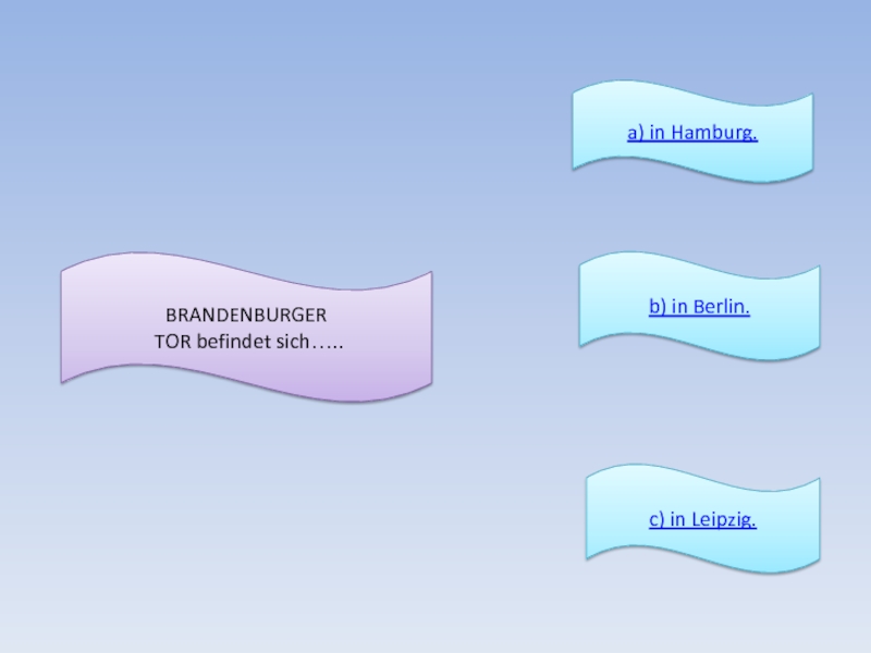 Wie jede Stadt hat Berlin viele schöne Sehenswürdigkeiten, viele schöne Gebäude, Straßen, Plätze, Parks. Dazu gehören das Brandenburger Tor, der Fernsehturm (Symbole der Stadt), der Alexanderplatz, der Treptower Park, wo das bekannte Ehrenmal des Sowjetsoldaten steht.