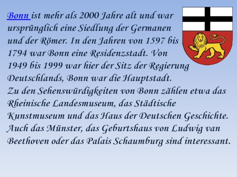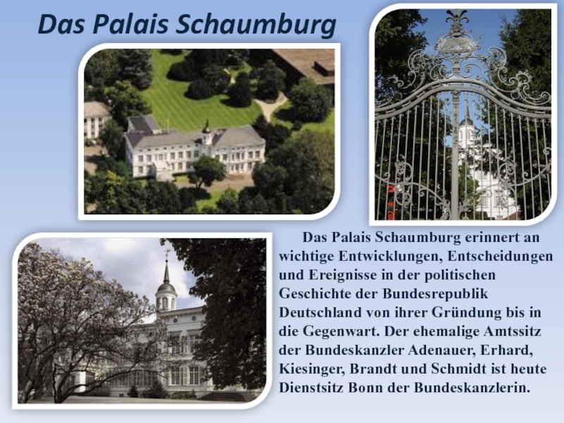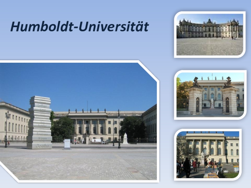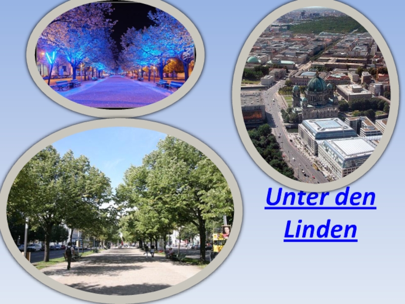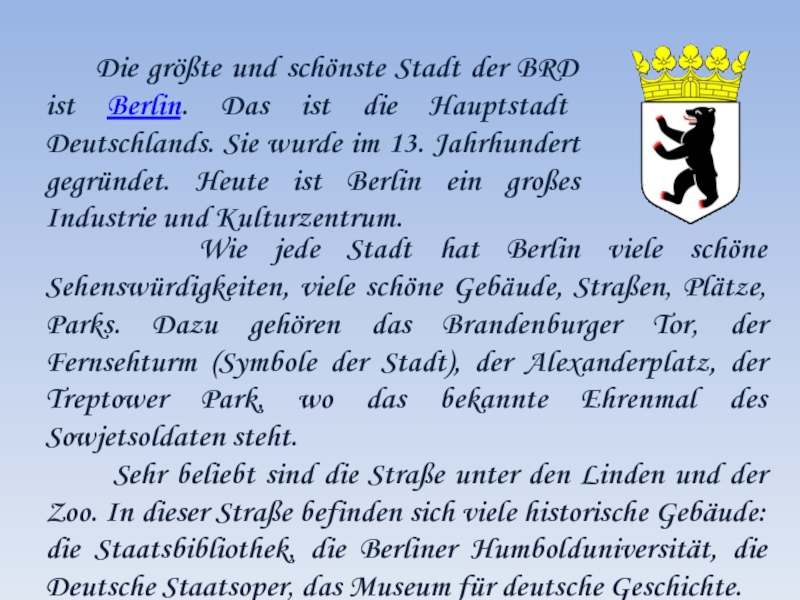 Sehr beliebt sind die Straße unter den Linden und der Zoo. In dieser Straße befinden sich viele historische Gebäude: die Staatsbibliothek, die Berliner Humbolduniversität, die Deutsche Staatsoper, das Museum für deutsche Geschichte.