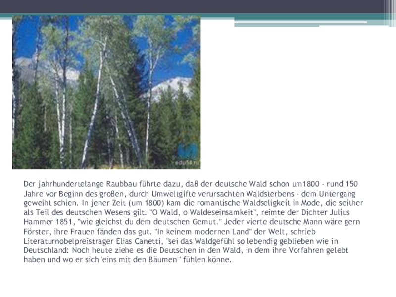 Слайд 3Der jahrhundertelange Raubbau führte dazu, daβ der deutsche Wald schon um1800