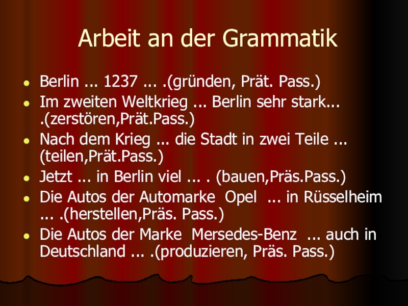 Weltkrieg ... Berlin sehr stark... .(zerstören,Prät.Pass.)
