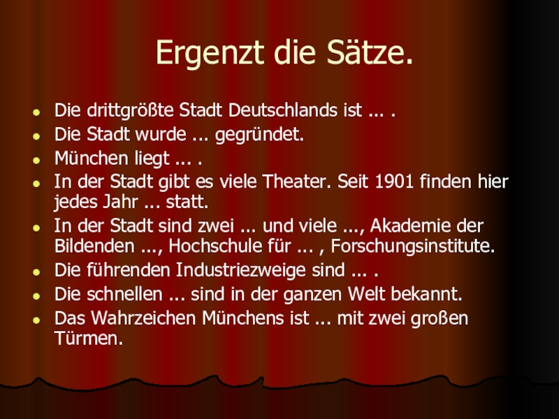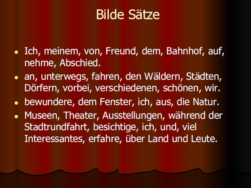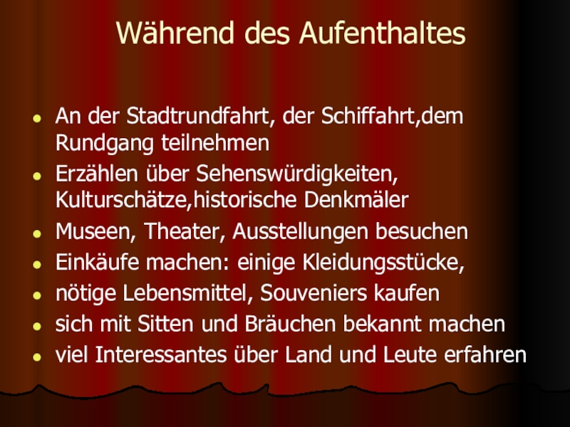 Museen, Theater, Ausstellungen, während der Stadtrundfahrt, besichtige, ich, und, viel Interessantes, erfahre, über Land und Leute.