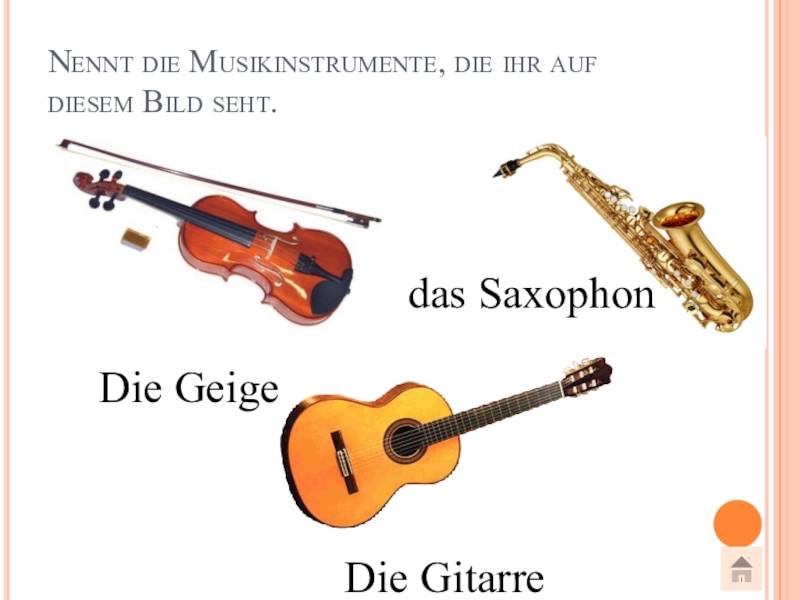 Nennt die Musikinstrumente, die ihr auf diesem Bild seht.Die GeigeDie Gitarredas Saxophon