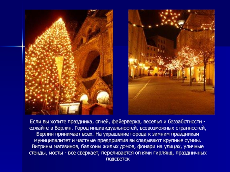 в Берлин. Город индивидуальностей, всевозможных странностей, Берлин принимает всех. На украшение города к зимним праздникам муниципалитет и частные предприятия выкладывают крупные суммы. Витрины магазинов, балконы жилых домов, фонари на улицах, уличные стенды, мосты - все сверкает, переливается огнями гирлянд, праздничных подсветок