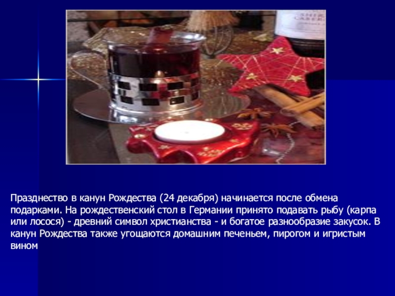 рождественский стол в Германии принято подавать рыбу (карпа или лосося) - древний символ христианства - и богатое разнообразие закусок. В канун Рождества также угощаются домашним печеньем, пирогом и игристым вином