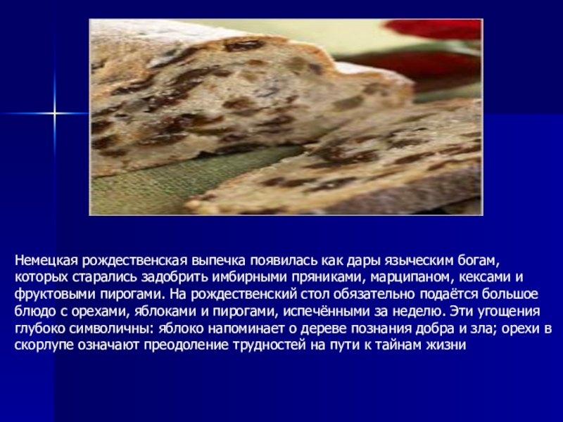 Слайд 23Немецкая рождественская выпечка появилась как дары языческим богам, которых старались задобрить