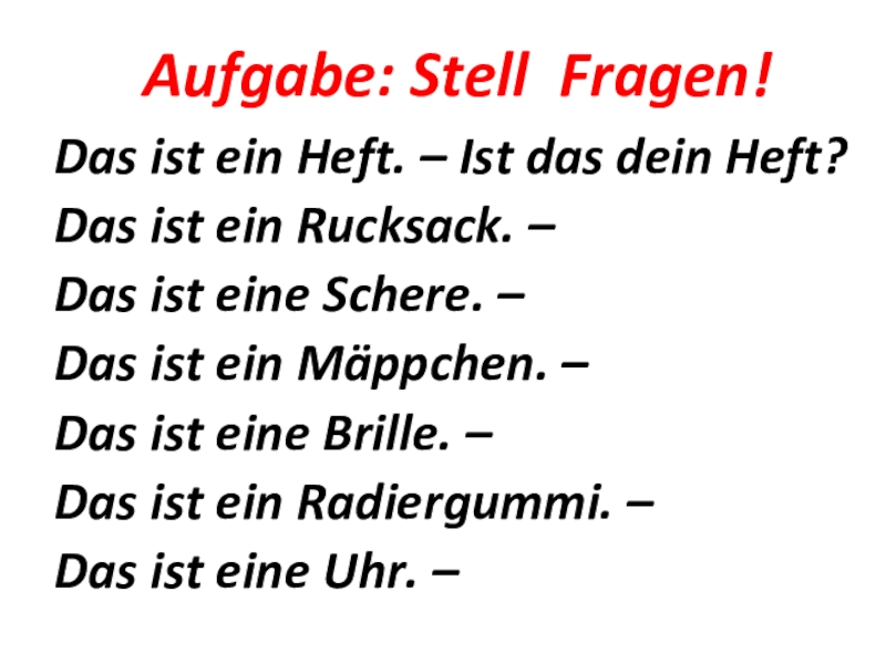 Aufgabe: Stell Fragen!Das ist ein Heft. – Ist das dein Heft?Das ist ein Rucksack. – Das ist