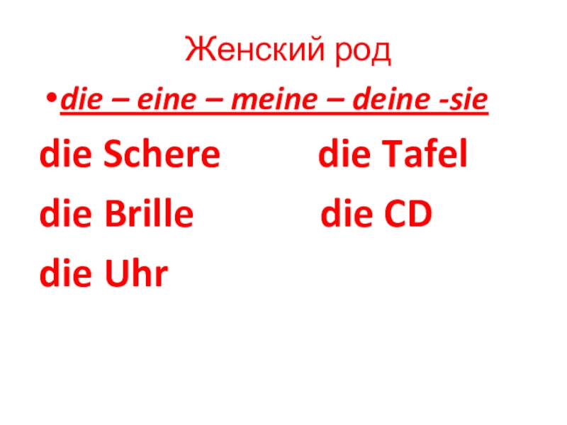 Женский родdie – eine – meine – deine -siedie Schere     die Tafeldie Brille