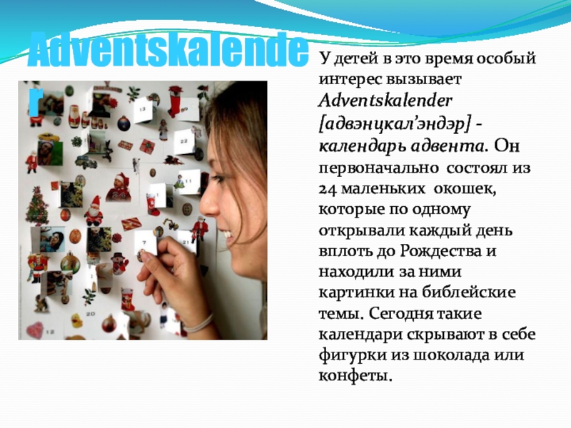 [адвэнцкал’эндэр] -календарь адвента. Он первоначально состоял из 24 маленьких окошек, которые по одному открывали каждый день вплоть до Рождества и находили за ними картинки на библейские темы. Сегодня такие календари скрывают в себе фигурки из шоколада или конфеты.