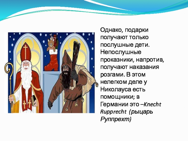 розгами. В этом нелегком деле у Николауса есть помощники; в Германии это –Knecht Rupprecht (рыцарь Руппрехт)