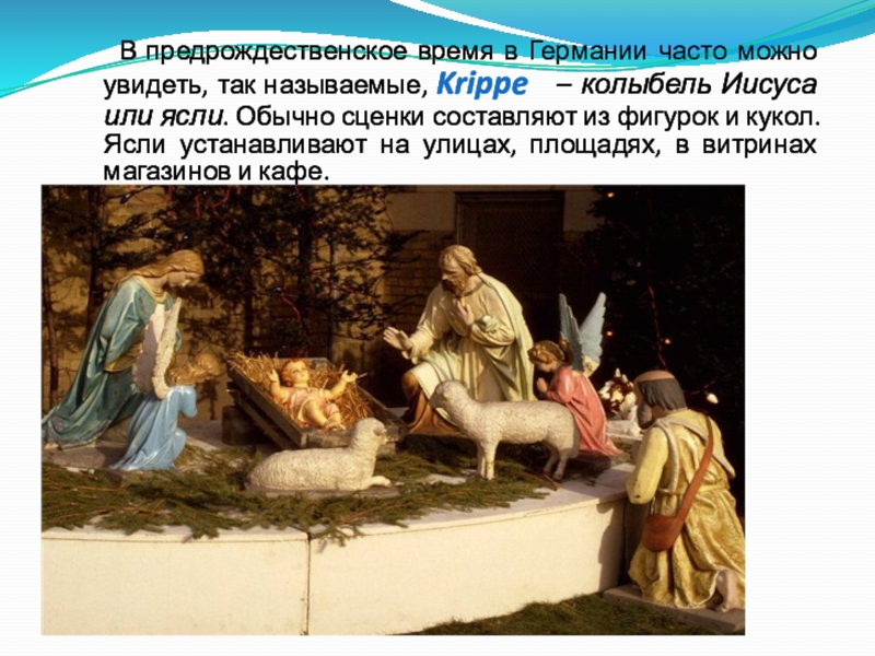 называемые, Krippe – колыбель Иисуса или ясли. Обычно сценки составляют из фигурок и кукол. Ясли устанавливают на улицах, площадях, в витринах магазинов и кафе.