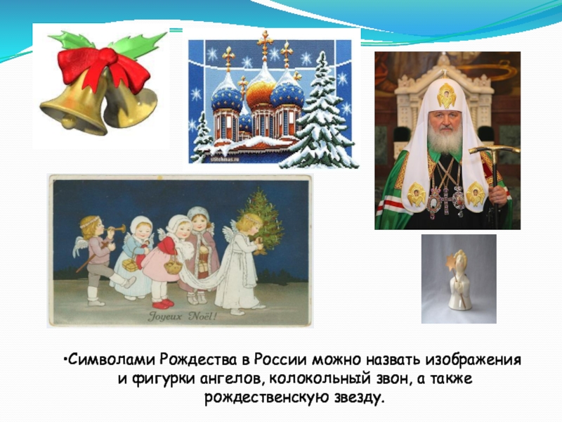 Слайд 35Символами Рождества в России можно назвать изображения и фигурки ангелов, колокольный