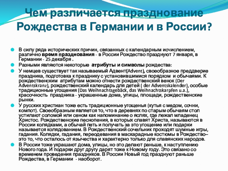 исторических причин, связанных с календарным исчислением, различно время празднования - в России Рождество празднуют 7 января, в Германии - 25 декабря .