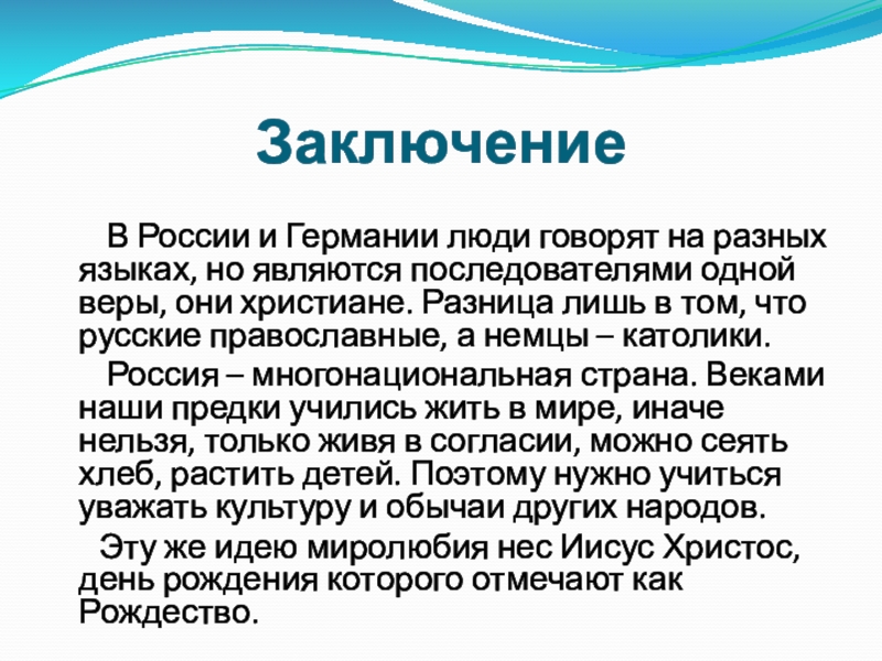 на разных языках, но являются последователями одной веры, они христиане. Разница лишь в том, что русские православные, а немцы – католики.