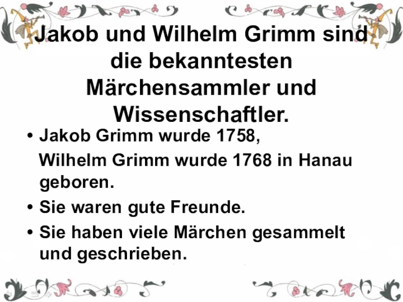 Слайд 13Jakob und Wilhelm Grimm sind die bekanntesten Märchensammler und Wissenschaftler.