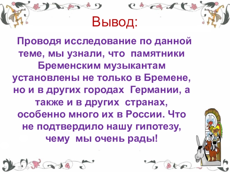 памятники Бременским музыкантам установлены не только в Бремене, но и в других городах Германии, а также и в других странах, особенно много их в России. Что не подтвердило нашу гипотезу, чему мы очень рады!