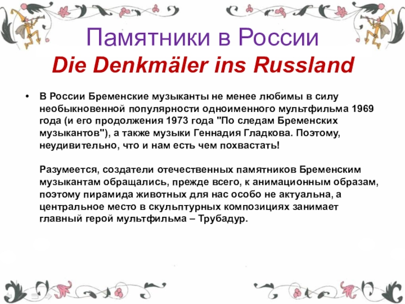 Разумеется, создатели отечественных памятников Бременским музыкантам обращались, прежде всего, к анимационным образам, поэтому пирамида животных для нас особо не актуальна, а центральное место в скульптурных композициях занимает главный герой мультфильма – Трубадур.