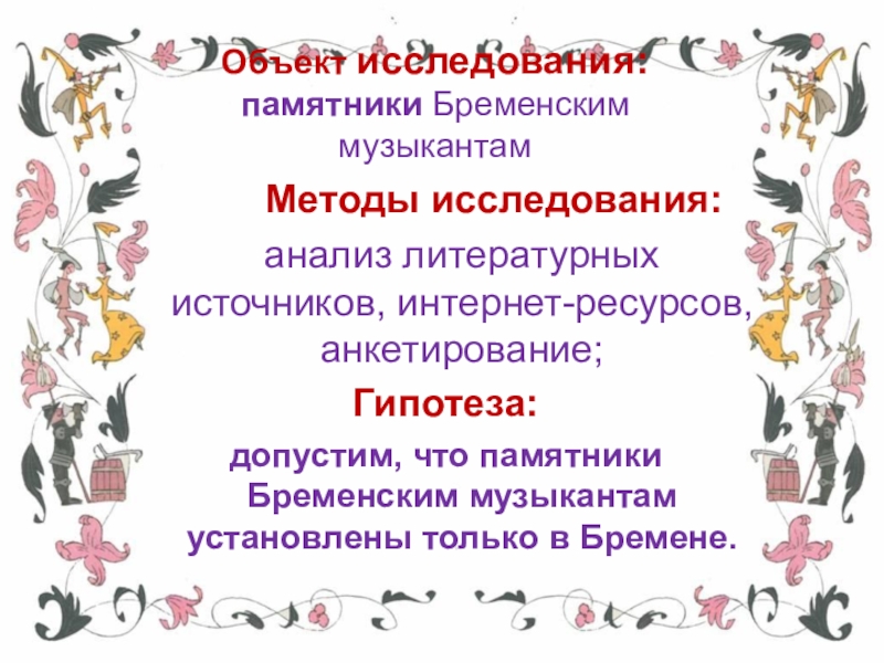 Слайд 6Объект исследования:памятники Бременским музыкантам