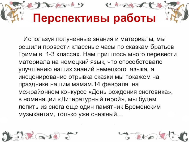 провести классные часы по сказкам братьев Гримм в 1-3 классах. Нам пришлось много перевести материала на немецкий язык, что способстовало улучшению наших знаний немецкого языка, а инсценирование отрывка сказки мы покажем на празднике нашим мамам.14 февраля на межрайонном конкурсе «День рождения снеговика», в номинации «Литературный герой», мы будем лепить из снега еще один памятник Бременским музыкантам, только уже снежный…