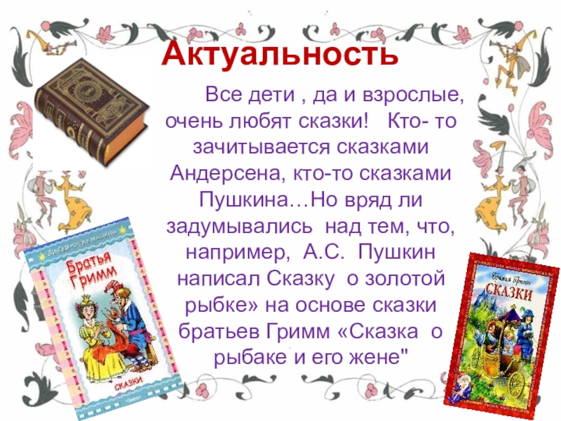 любят сказки! Кто- то зачитывается сказками Андерсена, кто-то сказками Пушкина…Но вряд ли задумывались над тем, что, например, А.С. Пушкин написал Сказку о золотой рыбке» на основе сказки братьев Гримм «Сказка о рыбаке и его жене"