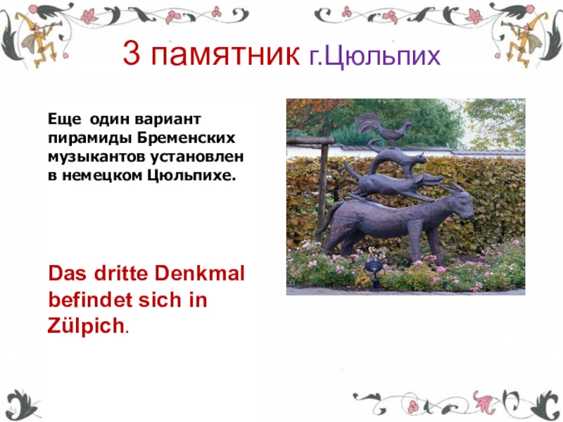 Еще один вариант пирамиды Бременских музыкантов установлен в немецком Цюльпихе.