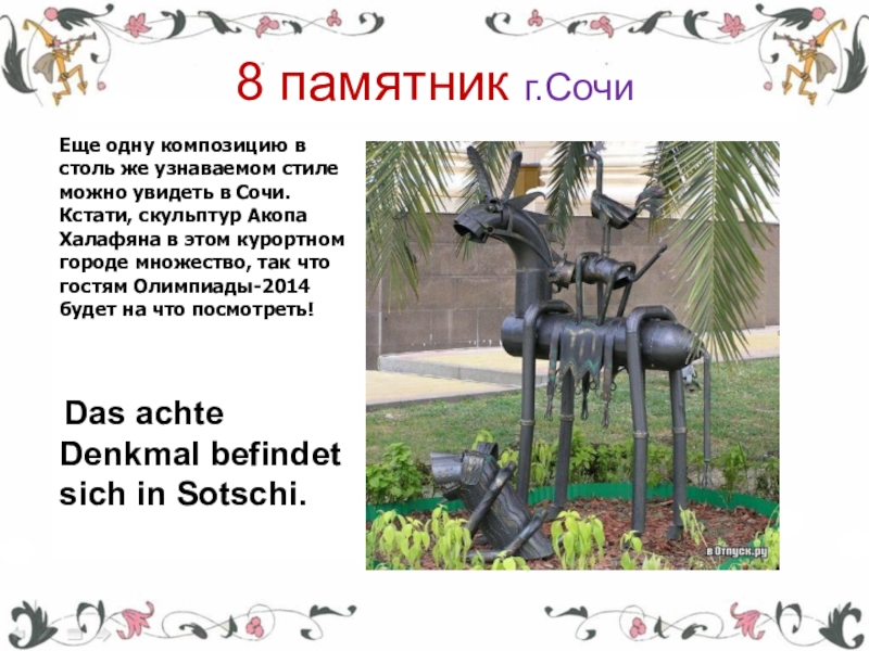 увидеть в Сочи. Кстати, скульптур Акопа Халафяна в этом курортном городе множество, так что гостям Олимпиады-2014 будет на что посмотреть!