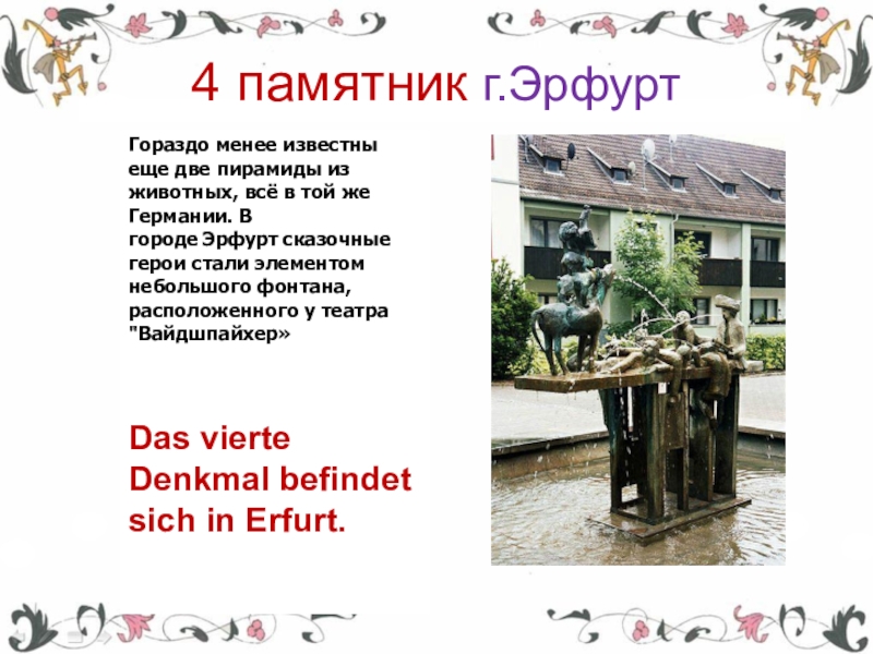 в той же Германии. В городе Эрфурт сказочные герои стали элементом небольшого фонтана, расположенного у театра "Вайдшпайхер»