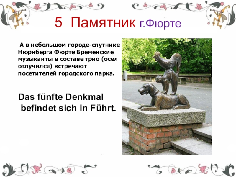 А в небольшом городе-спутнике Нюрнберга Фюрте Бременские музыканты в составе