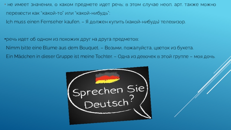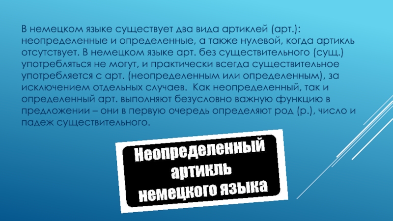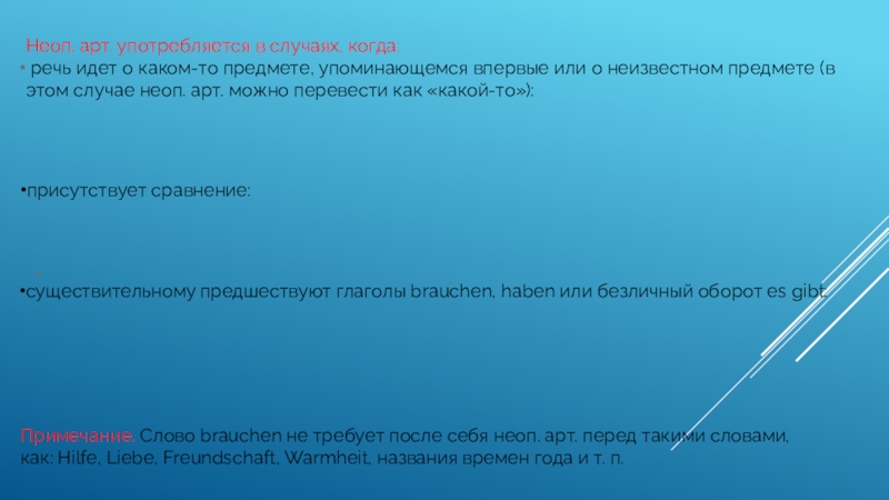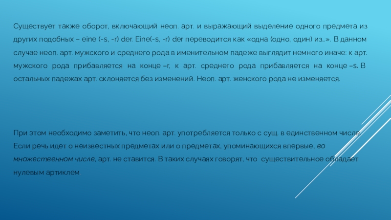 При этом необходимо заметить, что неоп. арт. употребляется только с сущ. в единственном числе. Если речь идет о неизвестных предметах или о предметах, упоминающихся впервые, во множественном числе, арт. не ставится. В таких случаях говорят, что существительное обладает нулевым артиклем.