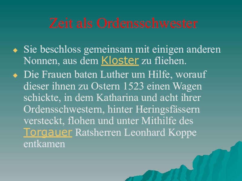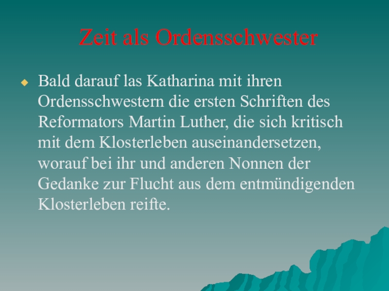 Schriften des Reformators Martin Luther, die sich kritisch mit dem Klosterleben auseinandersetzen, worauf bei ihr und anderen Nonnen der Gedanke zur Flucht aus dem entmündigenden Klosterleben reifte.