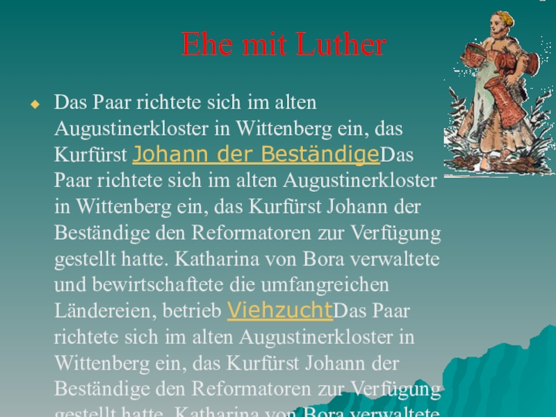 ein, das Kurfürst Johann der BeständigeDas Paar richtete sich im alten Augustinerkloster in Wittenberg ein, das Kurfürst Johann der Beständige den Reformatoren zur Verfügung gestellt hatte. Katharina von Bora verwaltete und bewirtschaftete die umfangreichen Ländereien, betrieb ViehzuchtDas Paar richtete sich im alten Augustinerkloster in Wittenberg ein, das Kurfürst Johann der Beständige den Reformatoren zur Verfügung gestellt hatte. Katharina von Bora verwaltete und bewirtschaftete die umfangreichen Ländereien, betrieb Viehzucht und eine BierbrauereiDas Paar richtete sich im alten Augustinerkloster in Wittenberg ein, das Kurfürst Johann der Beständige den Reformatoren zur Verfügung gestellt hatte. Katharina von Bora verwaltete und bewirtschaftete die umfangreichen Ländereien, betrieb Viehzucht und eine Bierbrauerei, um Luther, seine StudentenDas Paar richtete sich im alten Augustinerkloster in Wittenberg ein, das Kurfürst Johann der Beständige den Reformatoren zur Verfügung gestellt hatte. Katharina von Bora verwaltete und bewirtschaftete die umfangreichen Ländereien, betrieb Viehzucht und eine Bierbrauerei, um Luther, seine Studenten und Gäste zu verköstigen. In Zeiten der PestDas Paar richtete sich im alten Augustinerkloster in Wittenberg ein, das Kurfürst Johann der Beständige den Reformatoren zur Verfügung gestellt hatte. Katharina von Bora verwaltete und bewirtschaftete die umfangreichen Ländereien, betrieb Viehzucht und eine Bierbrauerei, um Luther, seine Studenten und Gäste zu verköstigen. In Zeiten der Pest führte sie zudem ein Hospiz, in dem sie mit anderen Frauen Kranke pflegten.