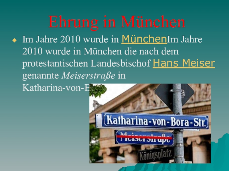 wurde in München die nach dem protestantischen Landesbischof Hans Meiser genannte Meiserstraße in Katharina-von-Bora-Straße umgenannt
