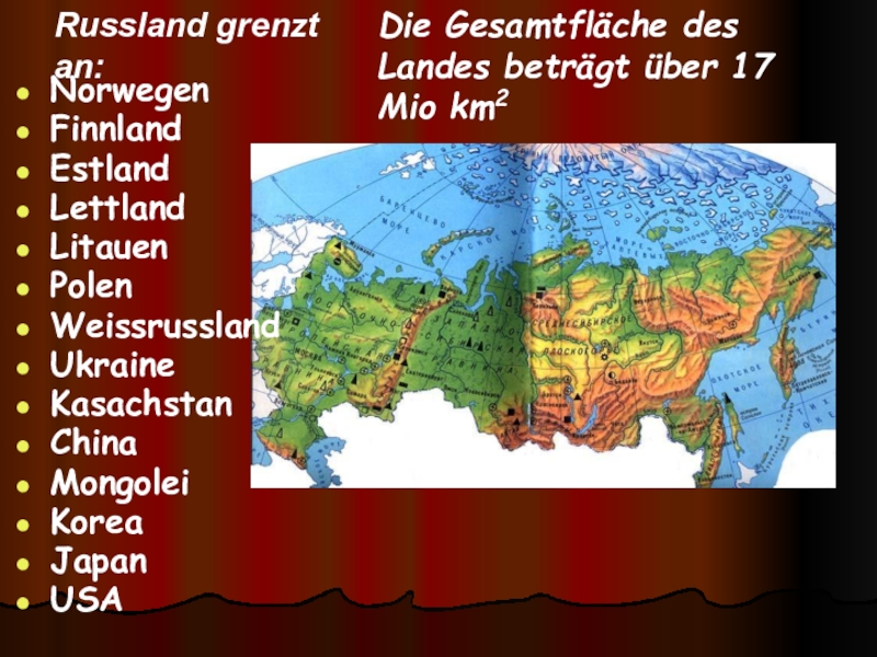 Die Gesamtfläche des Landes beträgt über 17 Mio km2Norwegen FinnlandEstlandLettlandLitauenPolenWeissrusslandUkraineKasachstanChinaMongoleiKoreaJapanUSARussland grenzt an: