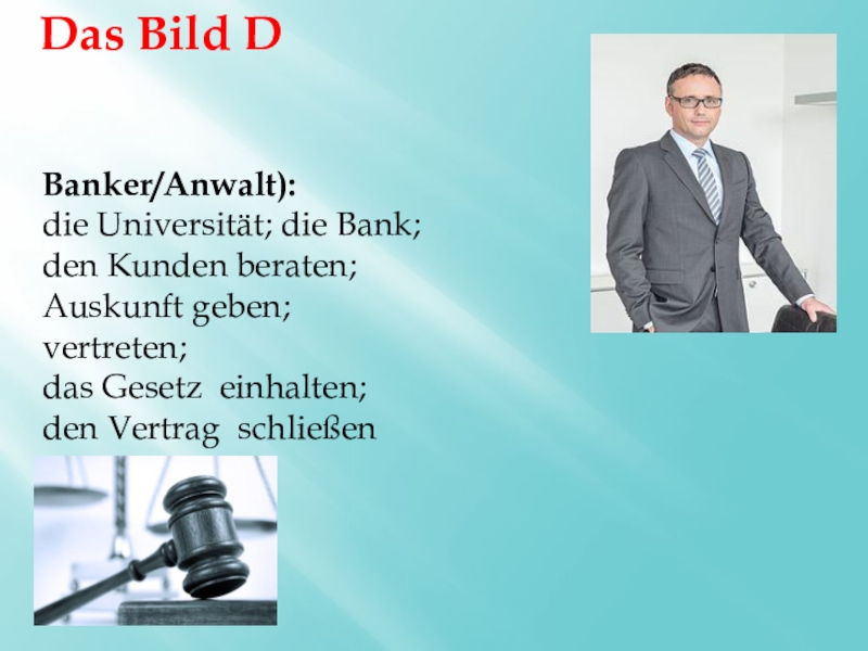 Das Bild D Banker/Anwalt): die Universität; die Bank; den Kunden beraten; Auskunft geben; vertreten; das Gesetz einhalten; den