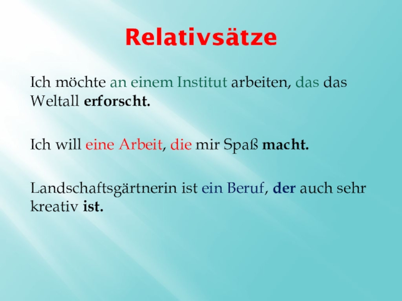 RelativsätzeIch möchte an einem Institut arbeiten, das das Weltall erforscht.Ich will eine Arbeit, die mir Spaß macht.Landschaftsgärtnerin