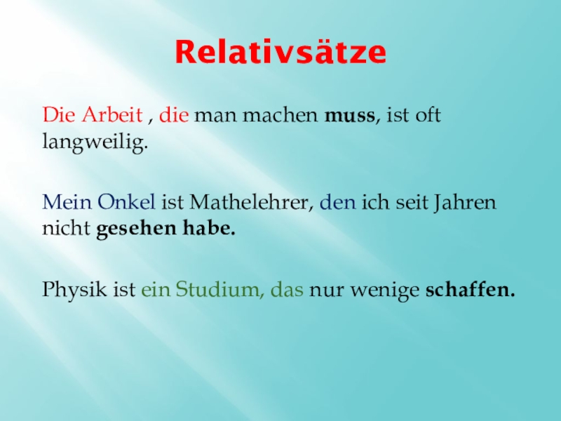 RelativsätzeDie Arbeit , die man machen muss, ist oft langweilig.Mein Onkel ist Mathelehrer, den ich seit Jahren