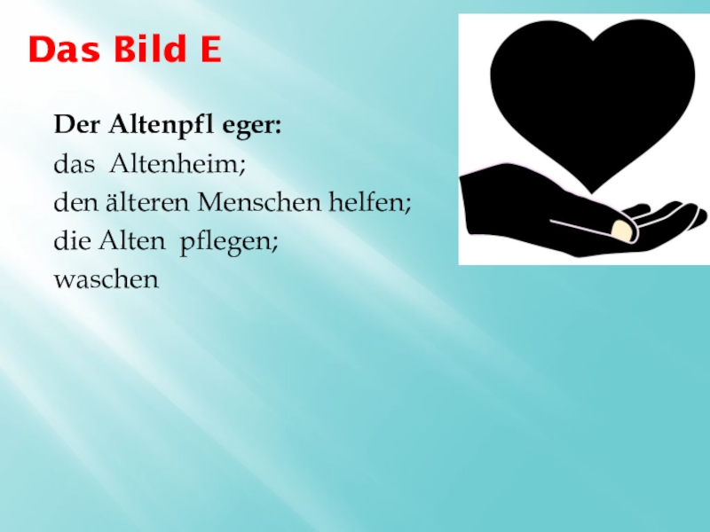 Das Bild EDer Altenpfl eger: das Altenheim; den älteren Menschen helfen; die Alten pflegen; waschen