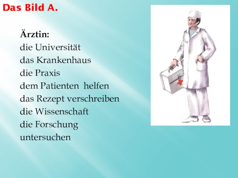 Das Bild A.Ärztin:die Universitätdas Krankenhausdie Praxisdem Patienten helfendas Rezept verschreibendie Wissenschaftdie Forschunguntersuchen
