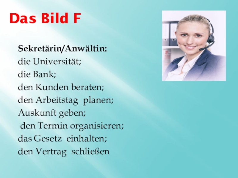 Das Bild FSekretärin/Anwältin: die Universität; die Bank; den Kunden beraten; den Arbeitstag planen; Auskunft geben; den Termin