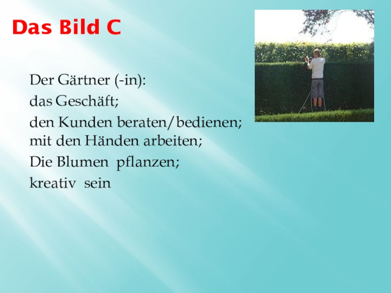 Das Bild CDer Gärtner (-in): das Geschäft; den Kunden beraten/bedienen; mit den Händen arbeiten; Die Blumen pflanzen;