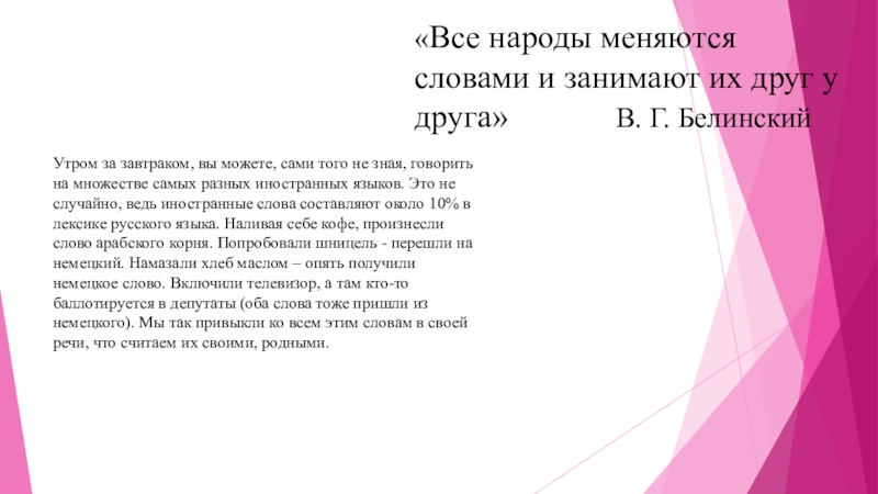 немецкий. Намазали хлеб маслом – опять получили немецкое слово. Включили телевизор, а там кто-то баллотируется в депутаты (оба слова тоже пришли из немецкого). Мы так привыкли ко всем этим словам в своей речи, что считаем их своими, родными.