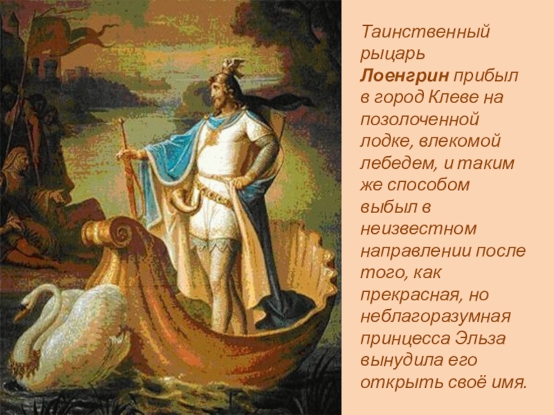 Таинственный рыцарь Лоенгрин прибыл в город Клеве на позолоченной лодке, влекомой лебедем, и таким же способом выбыл