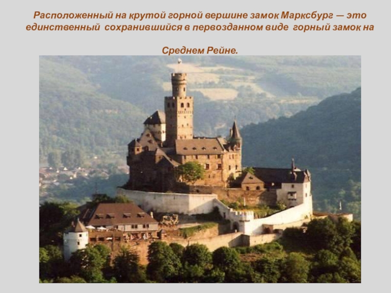Слайд 23Расположенный на крутой горной вершине замок Марксбург — это единственный сохранившийся