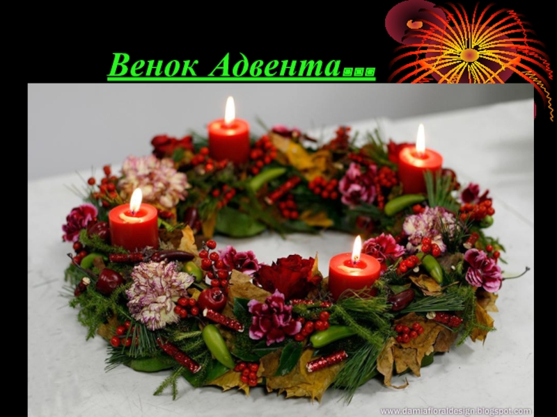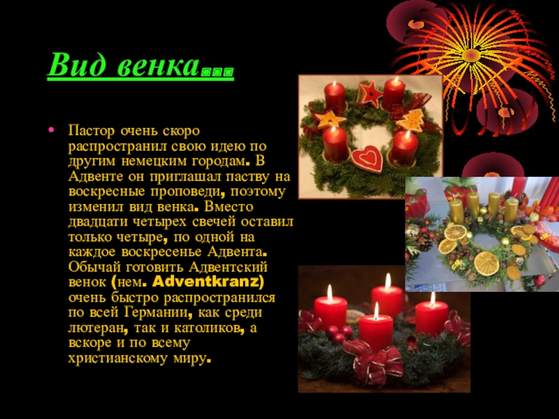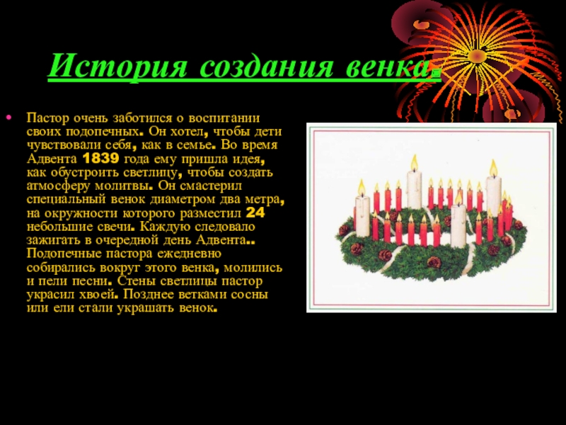 чтобы дети чувствовали себя, как в семье. Во время Адвента 1839 года ему пришла идея, как обустроить светлицу, чтобы создать атмосферу молитвы. Он смастерил специальный венок диаметром два метра, на окружности которого разместил 24 небольшие свечи. Каждую следовало зажигать в очередной день Адвента.. Подопечные пастора ежедневно собирались вокруг этого венка, молились и пели песни. Стены светлицы пастор украсил хвоей. Позднее ветками сосны или ели стали украшать венок.
