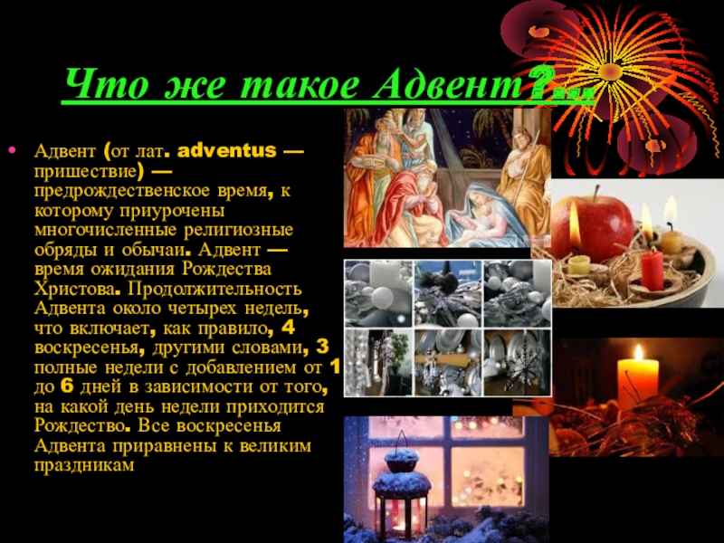 время, к которому приурочены многочисленные религиозные обряды и обычаи. Адвент — время ожидания Рождества Христова. Продолжительность Адвента около четырех недель, что включает, как правило, 4 воскресенья, другими словами, 3 полные недели с добавлением от 1 до 6 дней в зависимости от того, на какой день недели приходится Рождество. Все воскресенья Адвента приравнены к великим праздникам